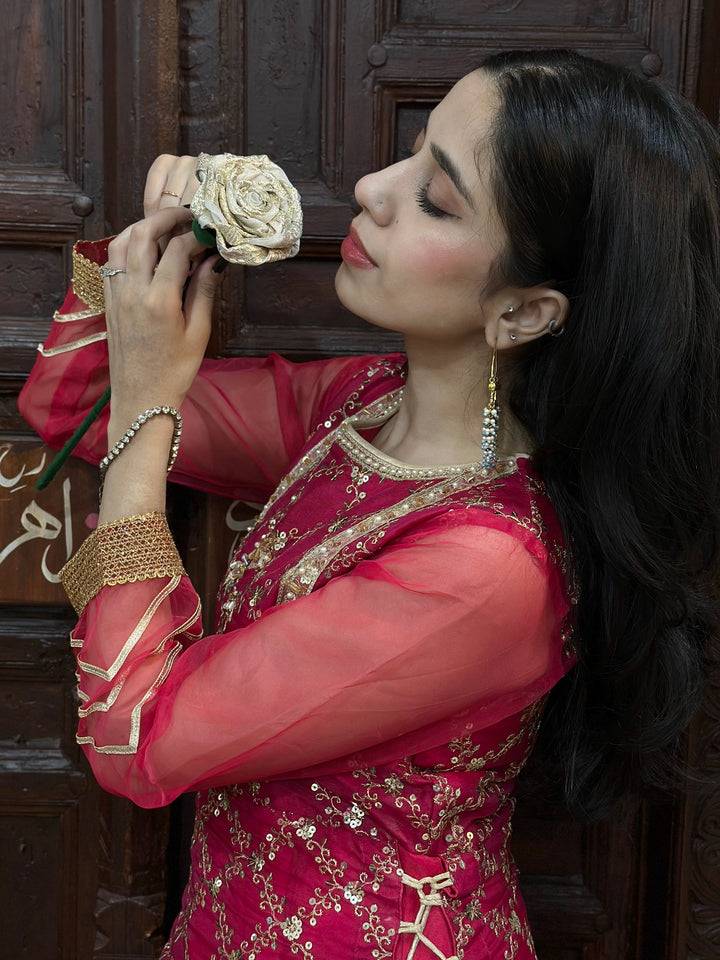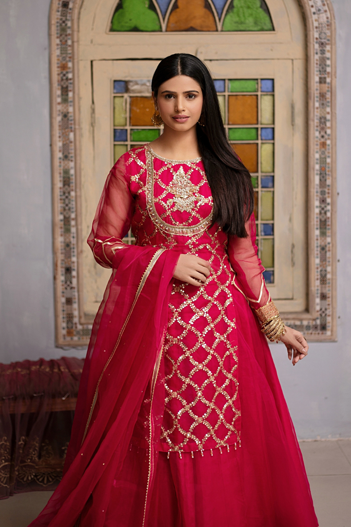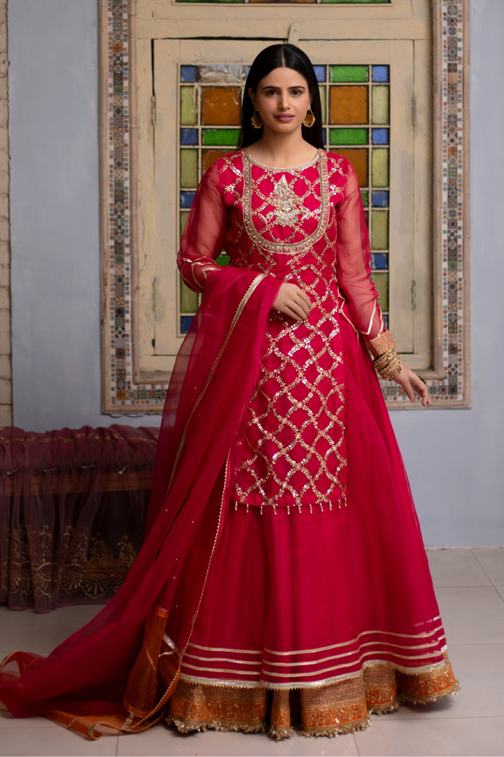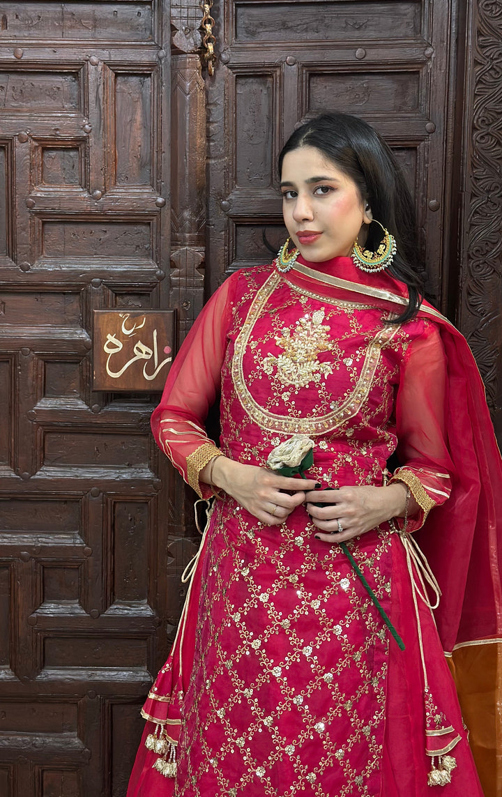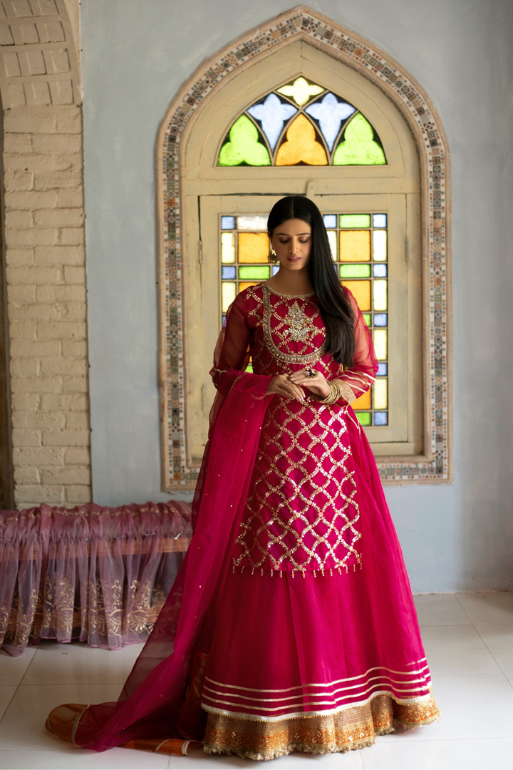 Shocking pink embroidered organza gown with organza lower layer. Beautiful embellished neckline. Laces on borders, tassels on sides. Paired with organza dupatta in double color orange and pink.