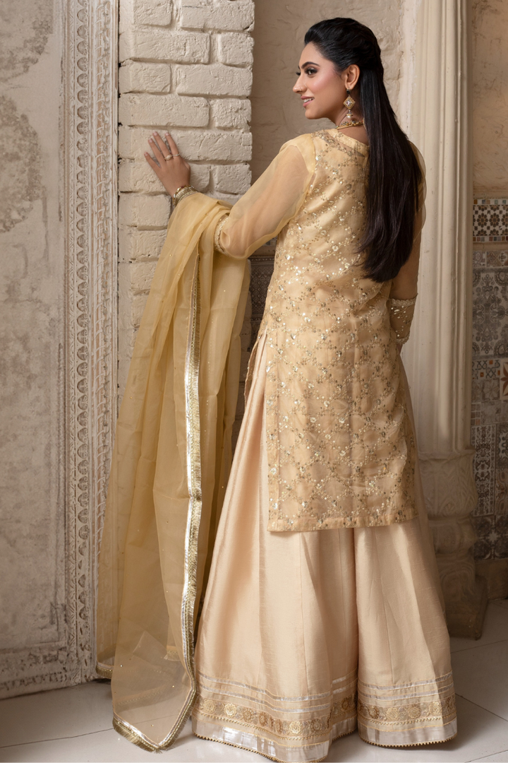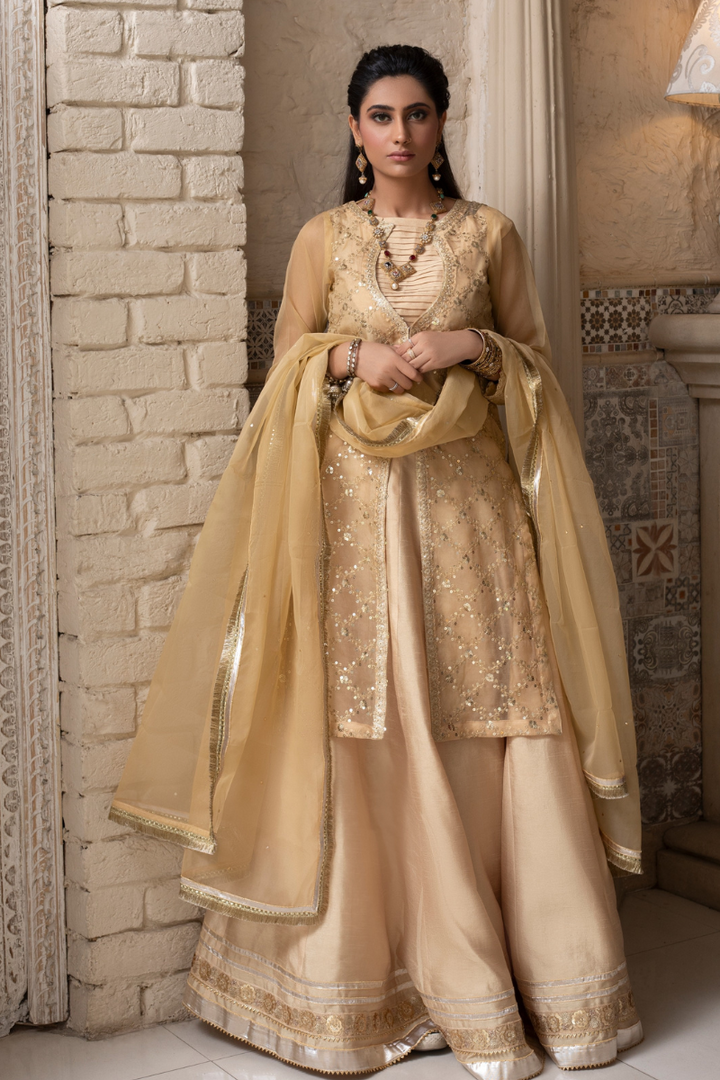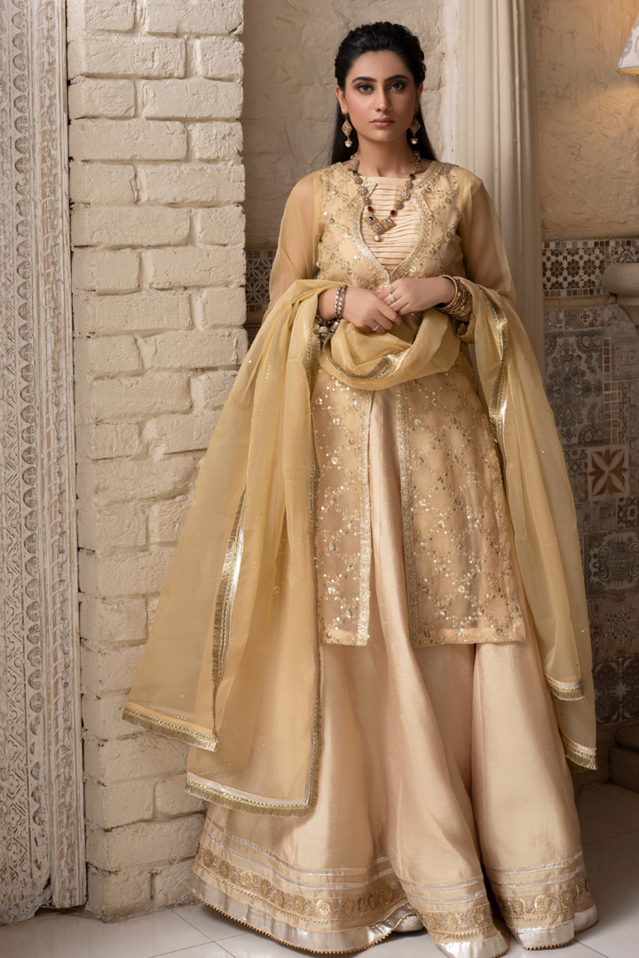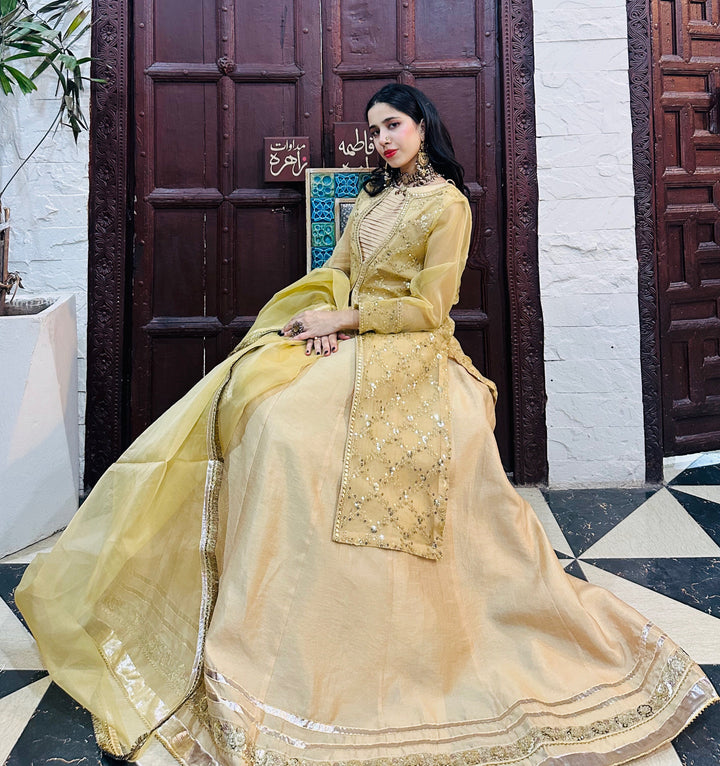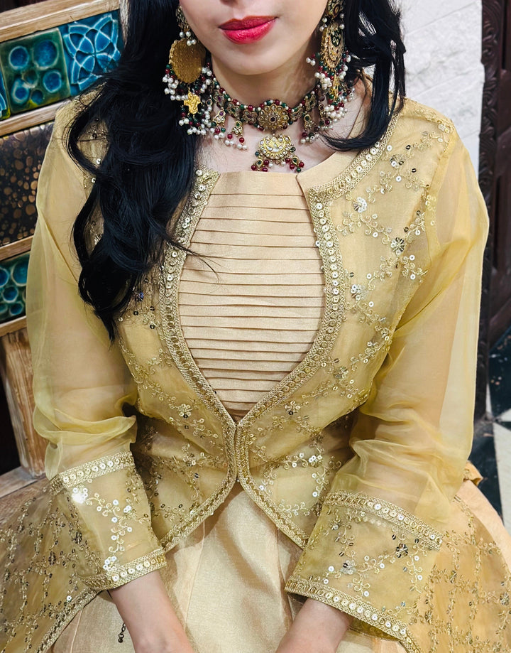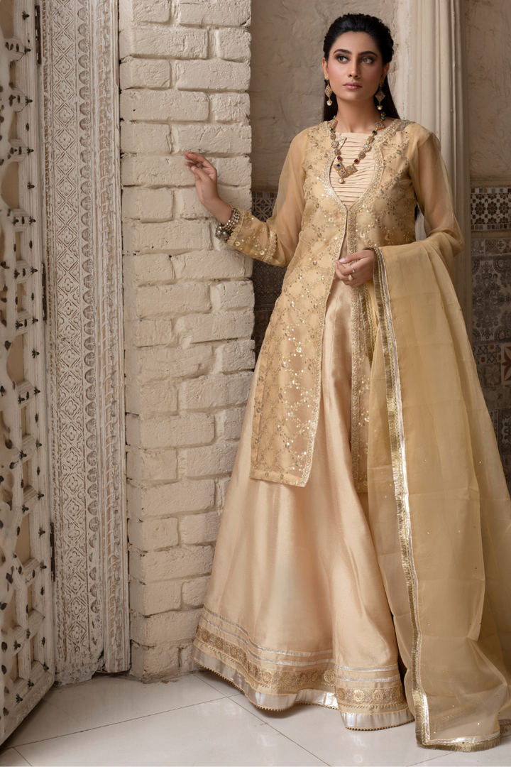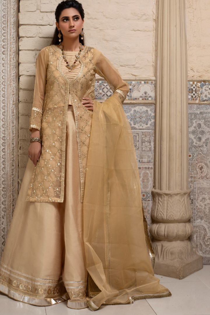 Beige embroidered organza front open gown with lace finishing.Raw silk pleated blouse and lehnga with lace,lappa and gotta border details.Paired with organza duppatta with gotta finishing.