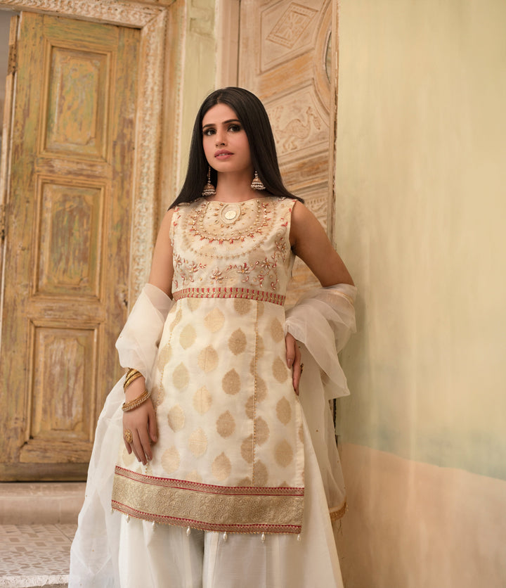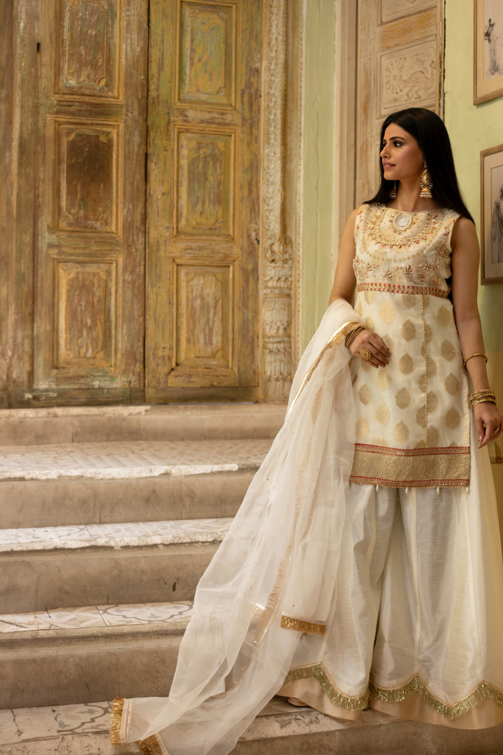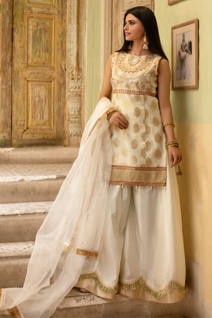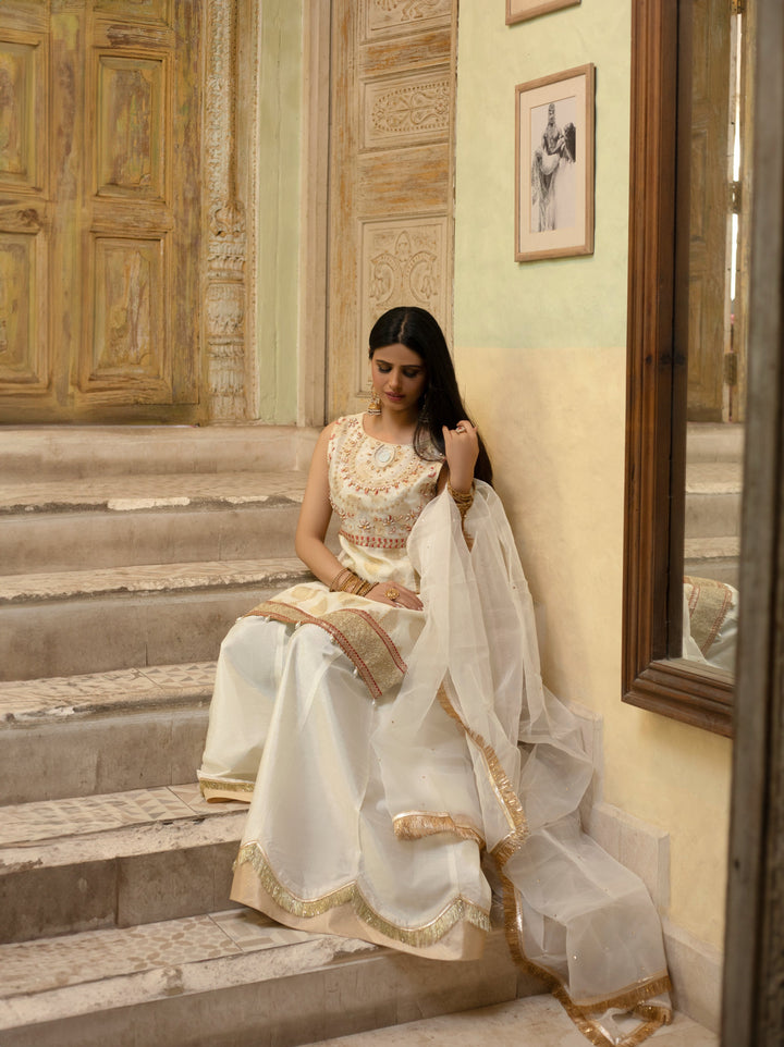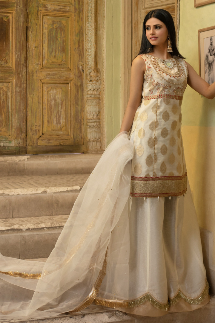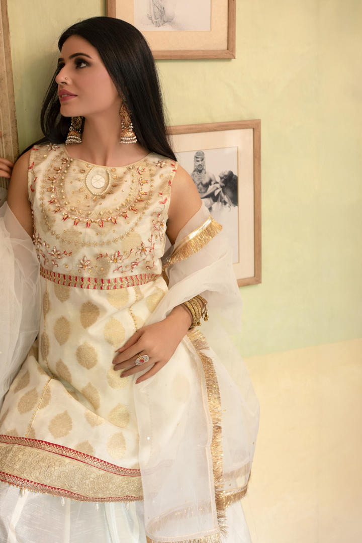 Paired with rawsilk sharara with gold tissue borders and white organza dupatta.