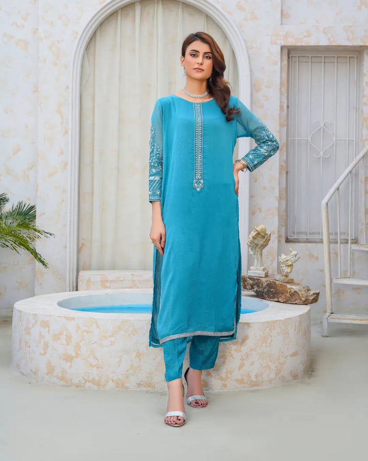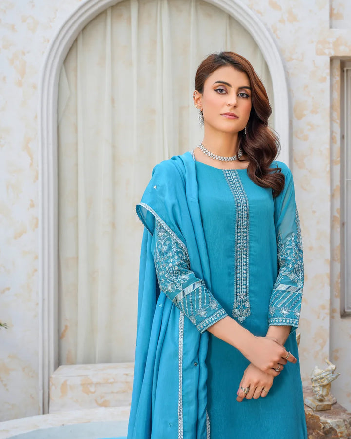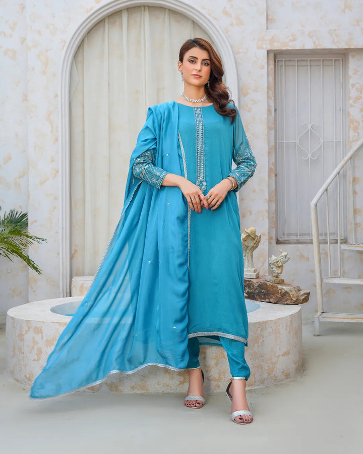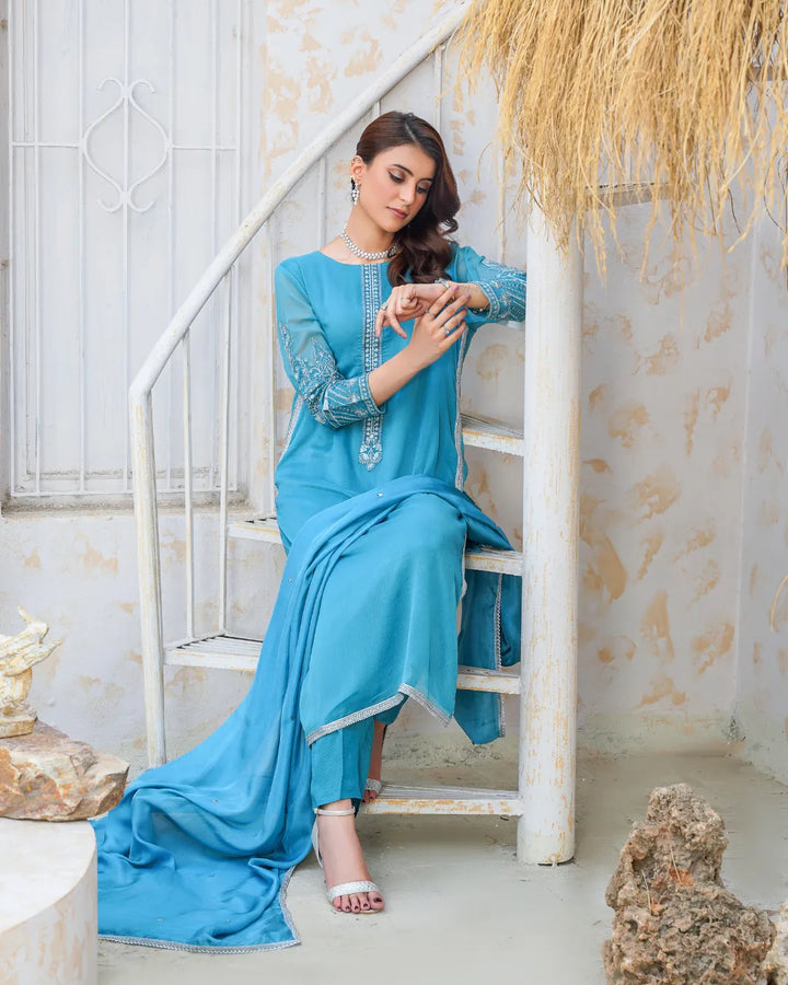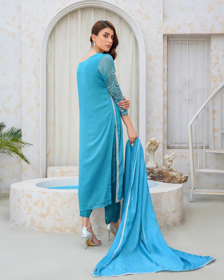Experience the timeless charm of traditional style with our Ocean Blue three-piece embroidered dress featuring a crinkle chiffon shirt Embroidery of tilla, Sequins and Resham thread on Sleeves and Neck Front and Silk dupatta with Silver Sequins all over and Laced with tilla lace on borders, paired with viscose raw silk trousers.