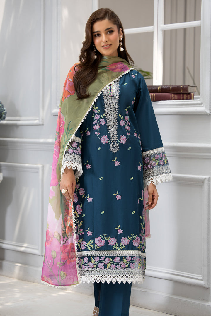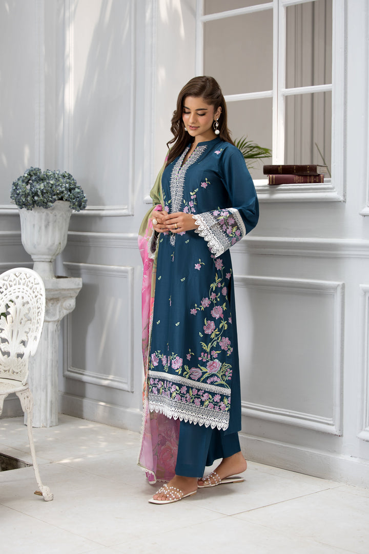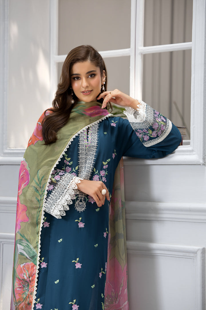 Shirt: Teal-toned embroidered lawn shirt adorned with delicate floral patterns and intricate lace detailing on the sleeves and hem.