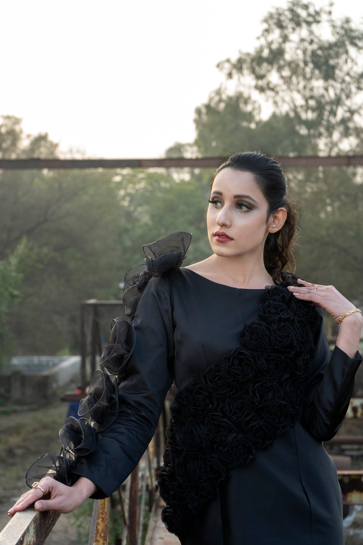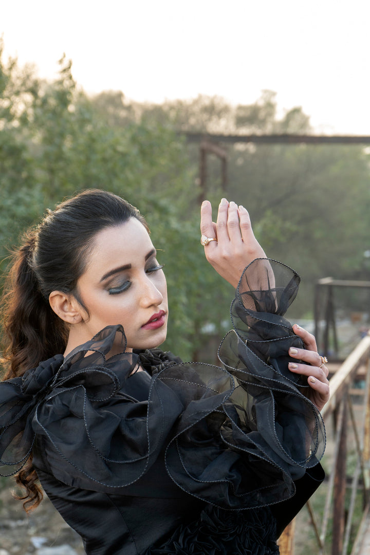 With the premium fabric, intricate details, and our finest professionals, exploring whole new horizons of women's Wear. The black maxi is brought to perfection with smoked patterns.