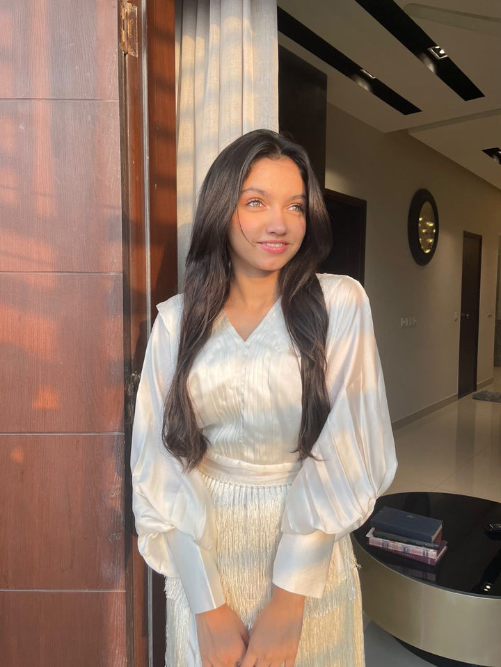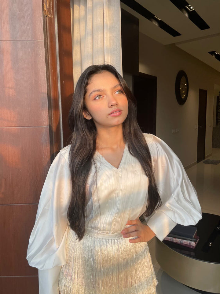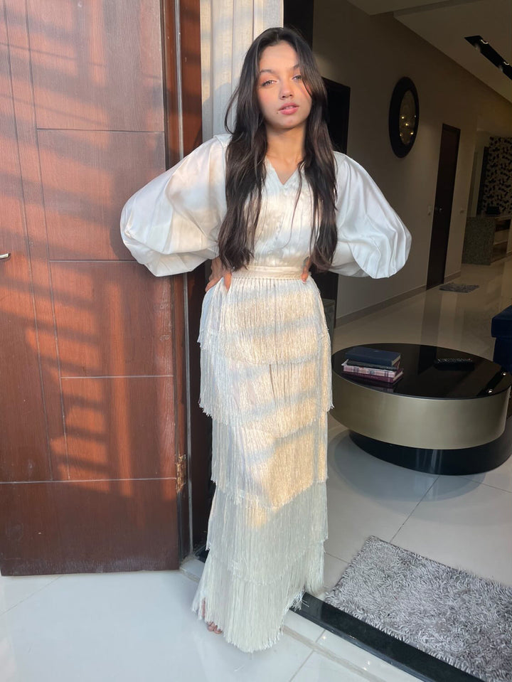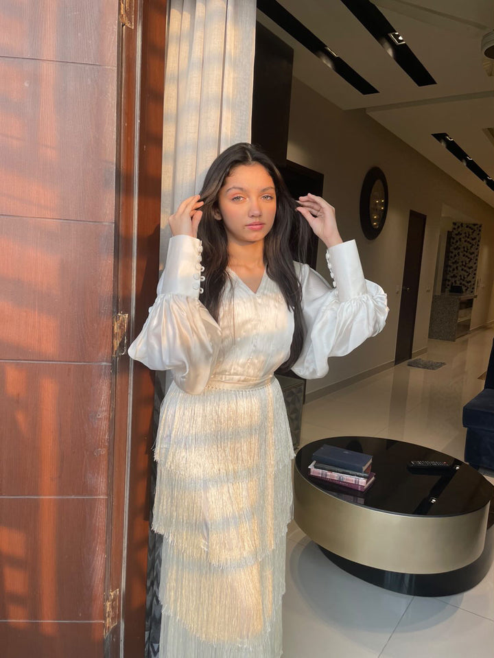 The off-white dress comes in Silk, featuring pleated V neckline and batwing sleeves with fringe all around.